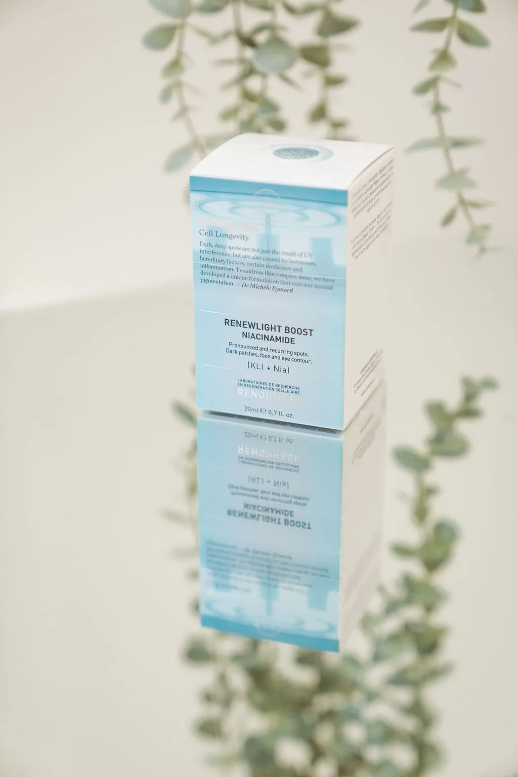 3. Breng een pompje Renewlight Boost Niacinamide aan op je gezicht, hals en decolleté